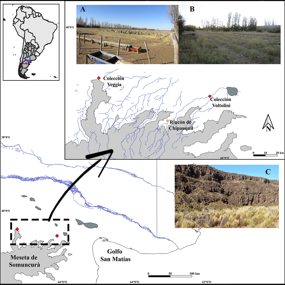 Las piezas analizadas comprenden un total de 46 artefactos alojados en dos colecciones arqueológicas procedentes del piedemonte de la meseta de Somuncurá: colecciones Voltolini y Veggia (Figura 1A y B). Ambas tienen información precisa de procedencia y fueron recolectadas por familias locales en terrenos de su propiedad. Al momento del estudio de las colecciones, sus colectores informaron que los materiales habían sido encontrados mientras realizaban actividades agrícolas a profundidades de entre 20 y 30 cm y que los habían resguardado en espacios cerrados. La colección Voltolini (n = 25) fue recuperada cerca del arroyo Valcheta a 2 km al norte de la localidad homónima y en 2018 fue donada por la familia al Museo Provincial María Inés Kopp. La colección Veggia (n = 21) se encuentra en la localidad de Ramos Mexía en manos de su colector original (Marcelo Veggia).