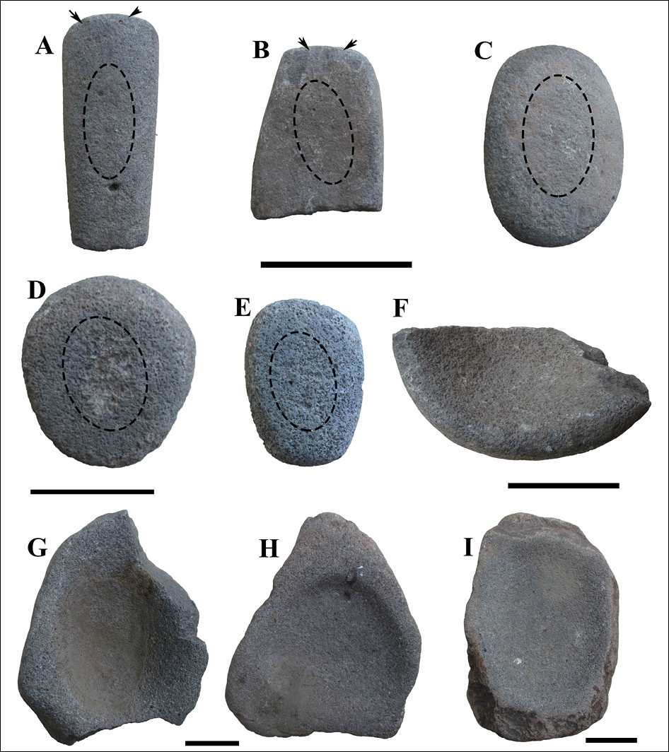 Figura 2. Artefactos de molienda de colección Voltolini. Referencias: A-B) manos de mortero simples; C-D) manos de molino simples; E) artefacto activo compuesto (mano de mortero-mano de molino); F-G) manos de molino dobles; H) molino simple; I-J) morteros simples. Escalas: 10 cm. Las líneas punteadas y las flechas indican la localización de las superficies activas.